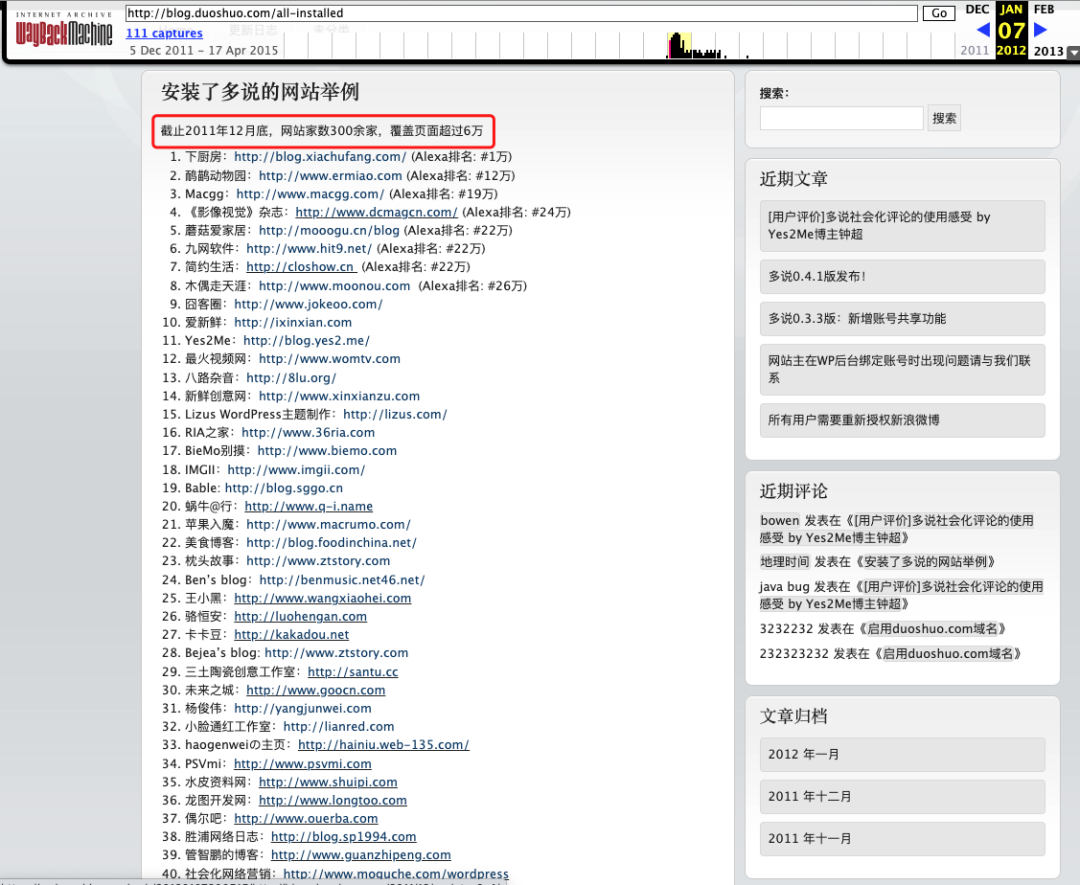 继续往后面看,2012年1月7日收录的这个页面显示,截止到2011年11月,已经有三百多家网站接入多说了。 这个发展速度还是不错的。