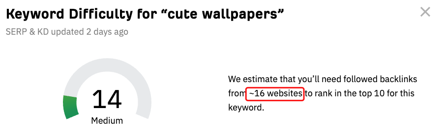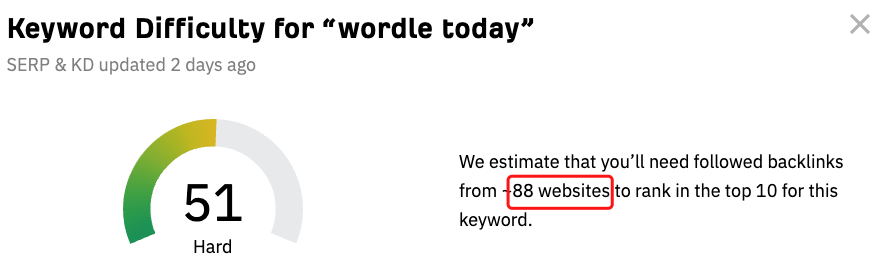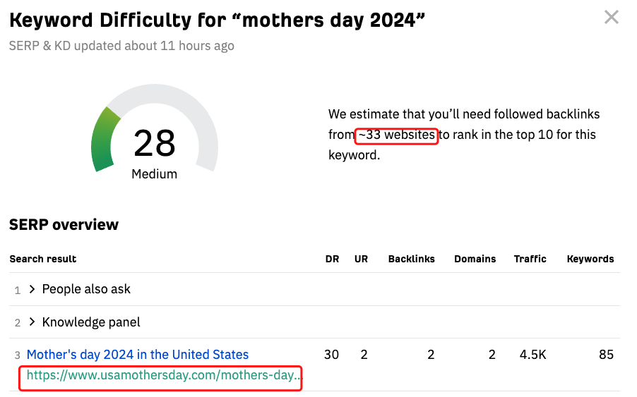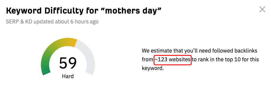 ahrefs 的难度也提到了59,需要123个优质外链网站才能够排到谷歌搜索结果前10。
