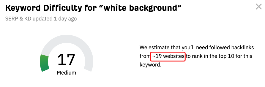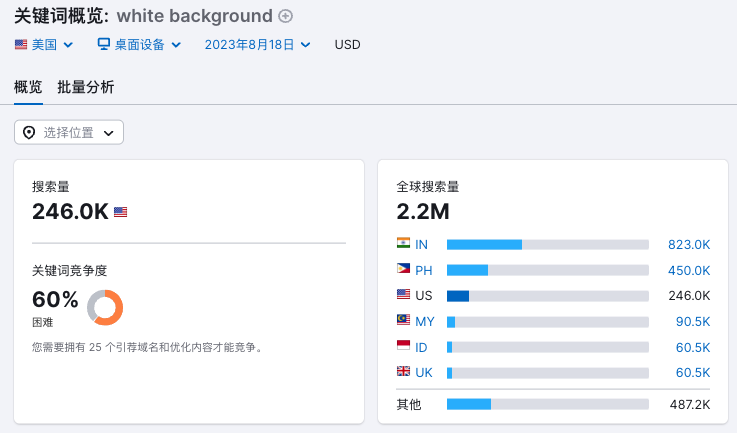 Semrush 显示,white background 全球搜索量 220万,关键词竞争度60%,属于有一点困难,但不算特别困难。