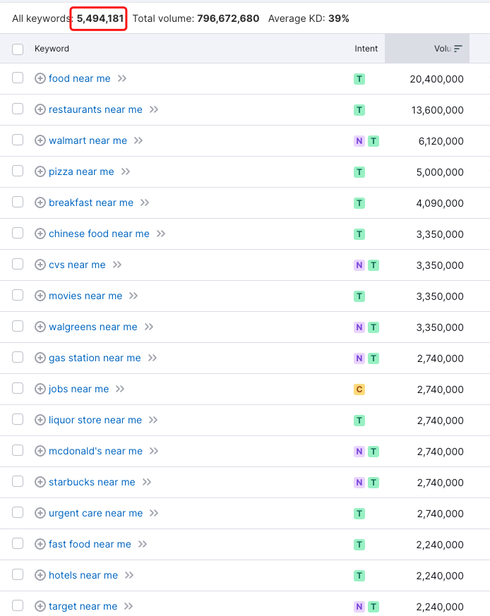 看上面的关键词列表就知道,用户可能会找各种各样的位置,一共有五百多万种。但我们不需要那么多,先只挑前面的1万个热门需求。