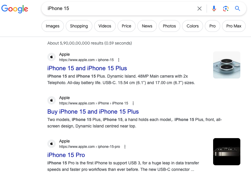 再举个例子,最近 iPhone 15 发售了,我们试试直接搜索“ iPhone 15 ”结果是什么。