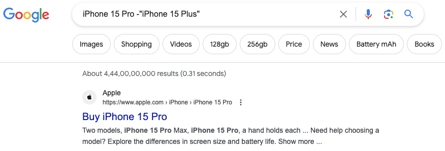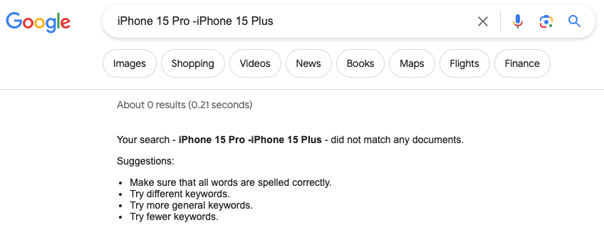 如果我们只想要找 “ iPhone 15 Pro ”的结果,就可以把 “ iPhone 15 Plus ”给排除掉,那么搜索词是不是这么写“ iPhone 15 Pro - iPhone 15 Plus ”呢?