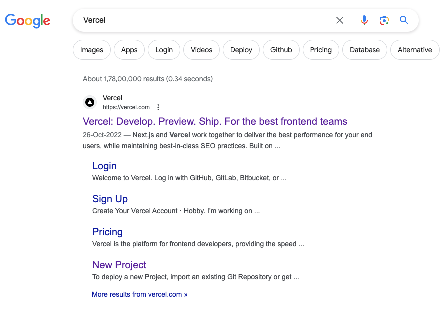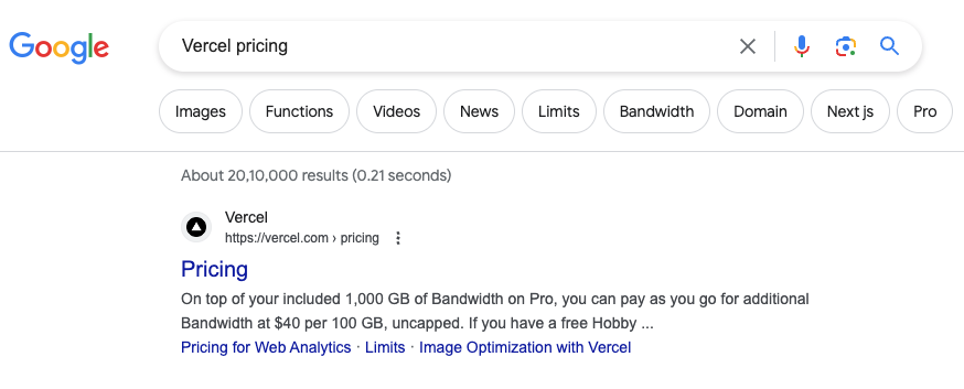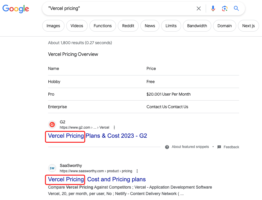 有时候搜索的关键词包含多个词时,只会部分命中,如搜索“Vercel pricing”,谷歌会自动判断“Vercel”是一个网站,你想找这个网站的价格信息,所以给你展示“https://vercel.com/pricing”页面。