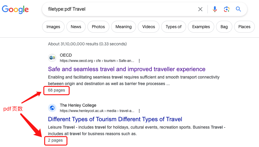 用途是限定搜索结果的文件类型,如可以用“filetype:pdf Travel”来找到所有关于旅游相关的pdf文件。