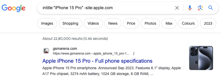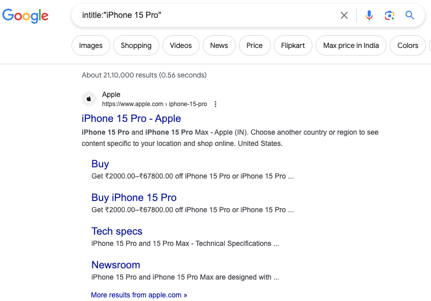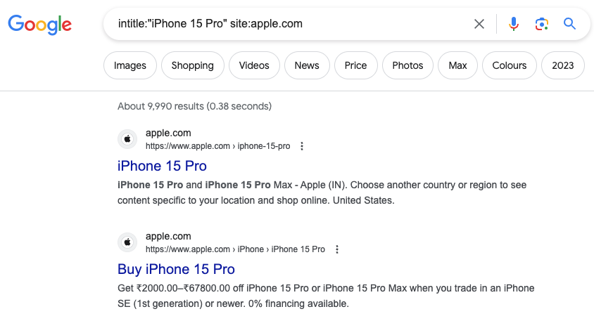 或者“intitle:"iPhone 15 Pro" site:apple.com”。