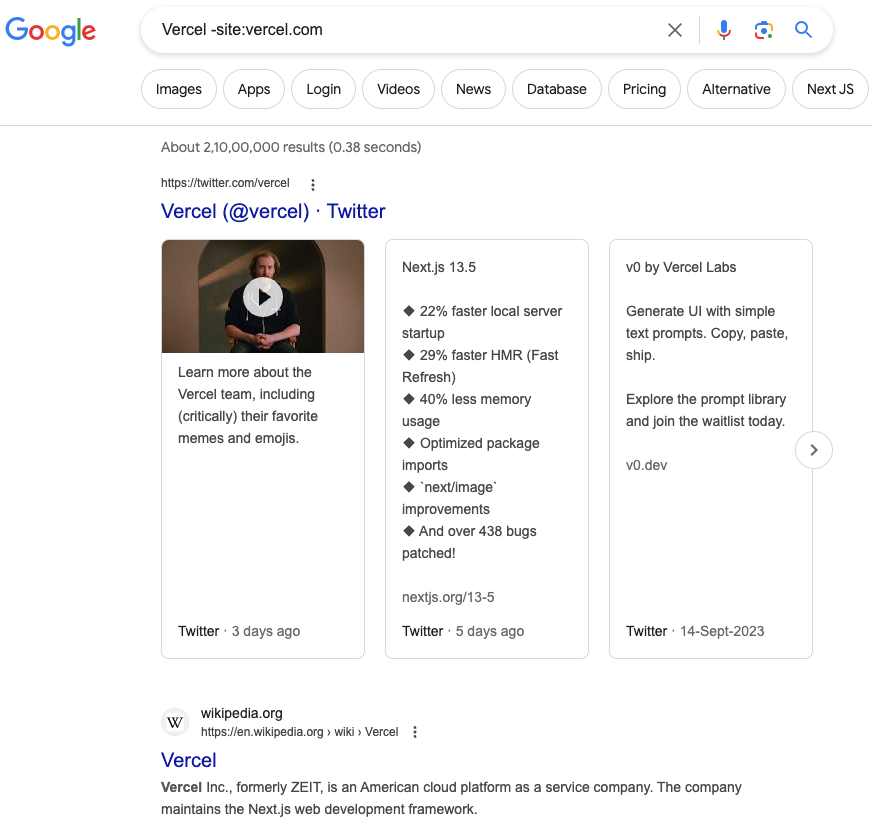 如搜索“Vercel -site:vercel.com”,就是说搜索所有非vercel官方域名下的“Vercel”结果。