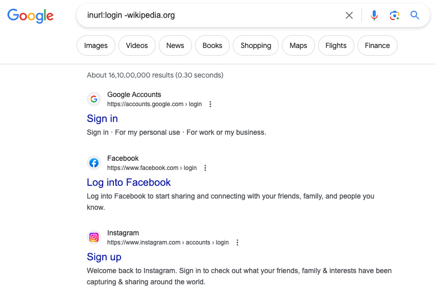 如我们可以用“inurl:login”来找到各个网站的登录页面,这里排除维基百科是为了去掉百科中关于“login”的介绍结果 页面 。