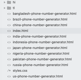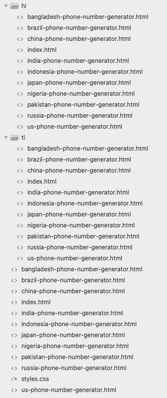 接着,我们把所有处理好的 .html 文件复制,然后分别粘贴到 /hi/ 和 /tl/ 目录,做完之后,我们网站目前的目录结构如下: