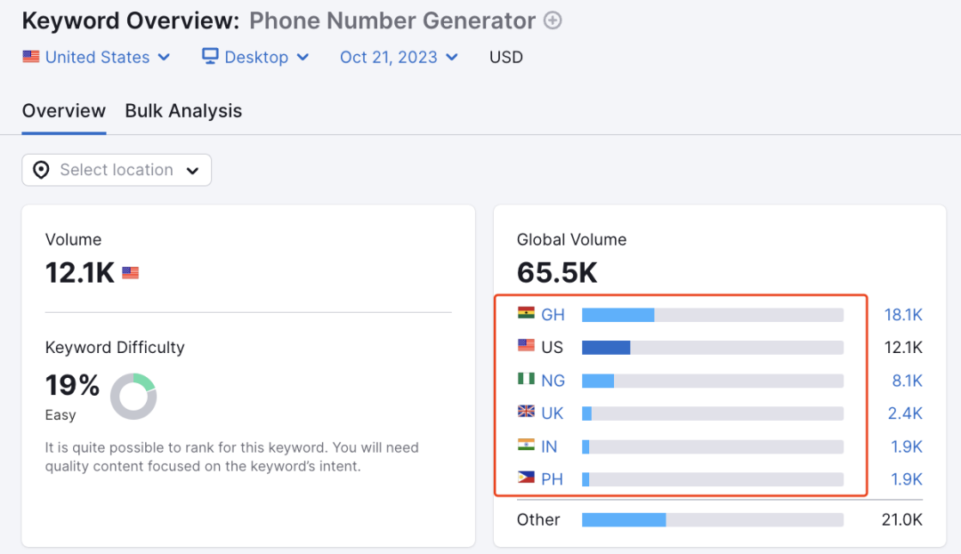 那么到底要做哪些语言呢?我们用数据说话,打开Semrush,查看这个关键词各个国家的搜索量。