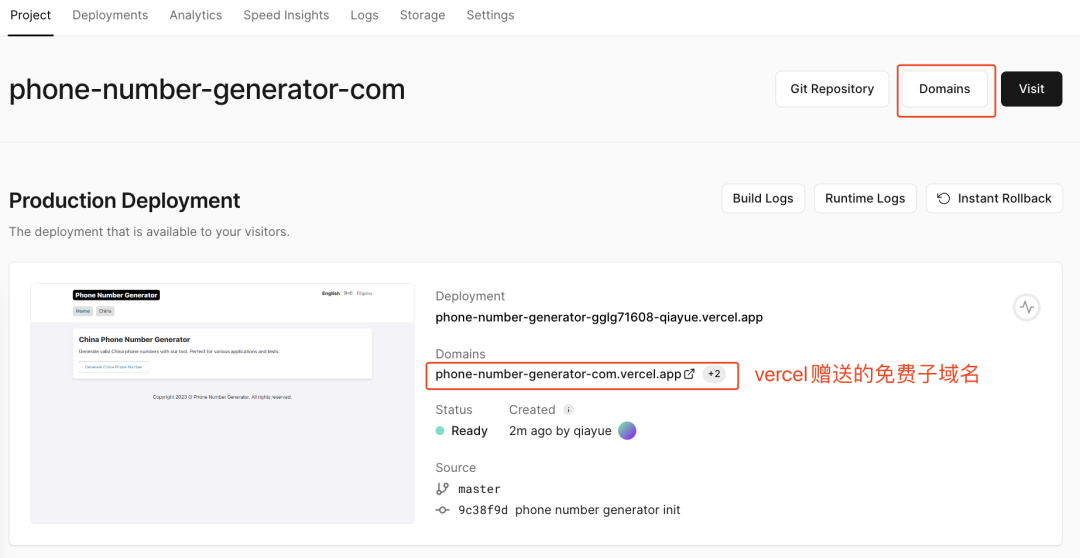 Vercel 送了一个子域名给我们测试用,可以点击这个域名看看网页,但我们不用这个子域名,我们点击右上角的“Domains”按钮,进入自定义域名配置界面。