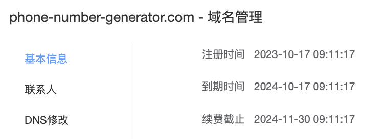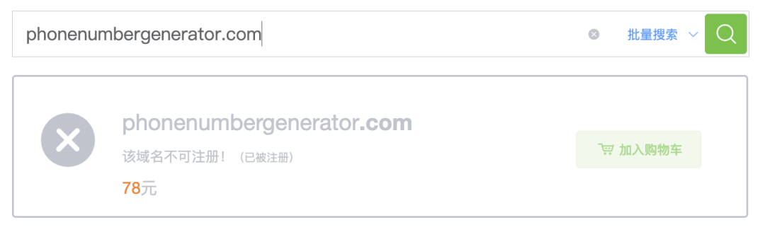 通常来讲,我们做这类关键词搞流量的网站,那么最好直接拿关键词去注册域名,我们先用 phonenumbergenerator.com 试一下,结果发现域名已经被人注册了。