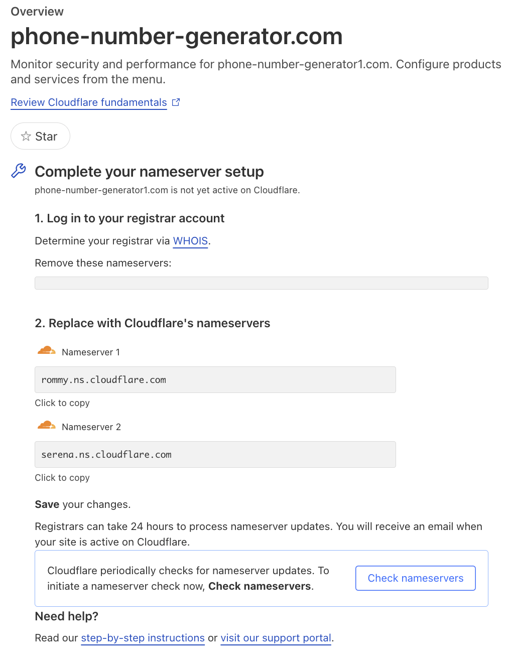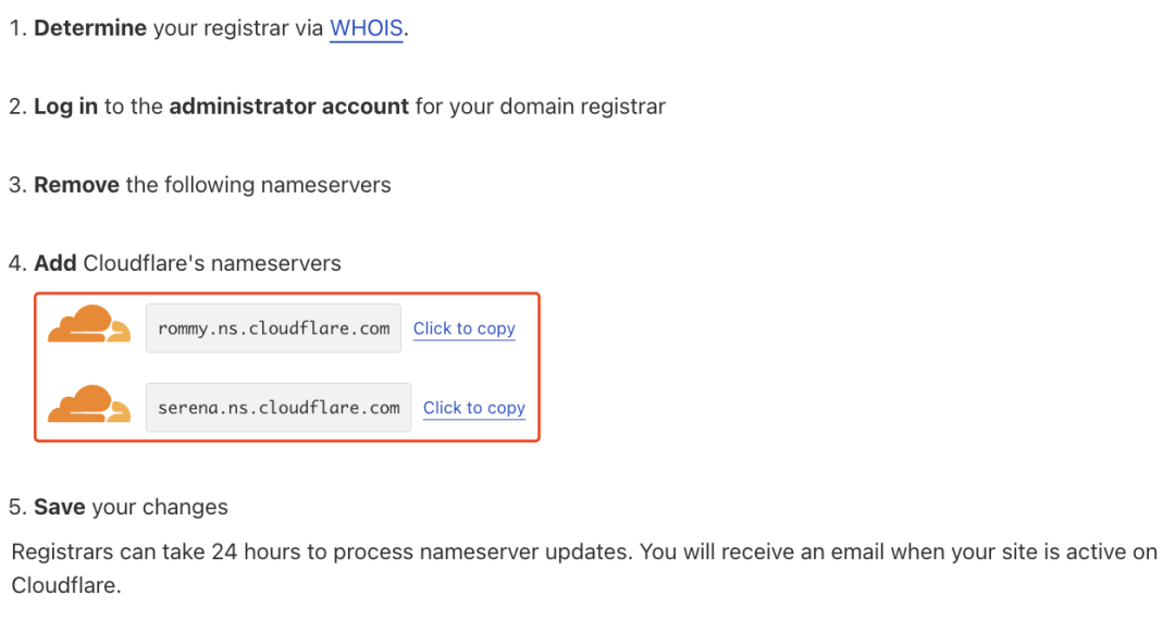 之后会显示新的 dns 服务器地址,我们需要复制之后,到域名注册商处修改。