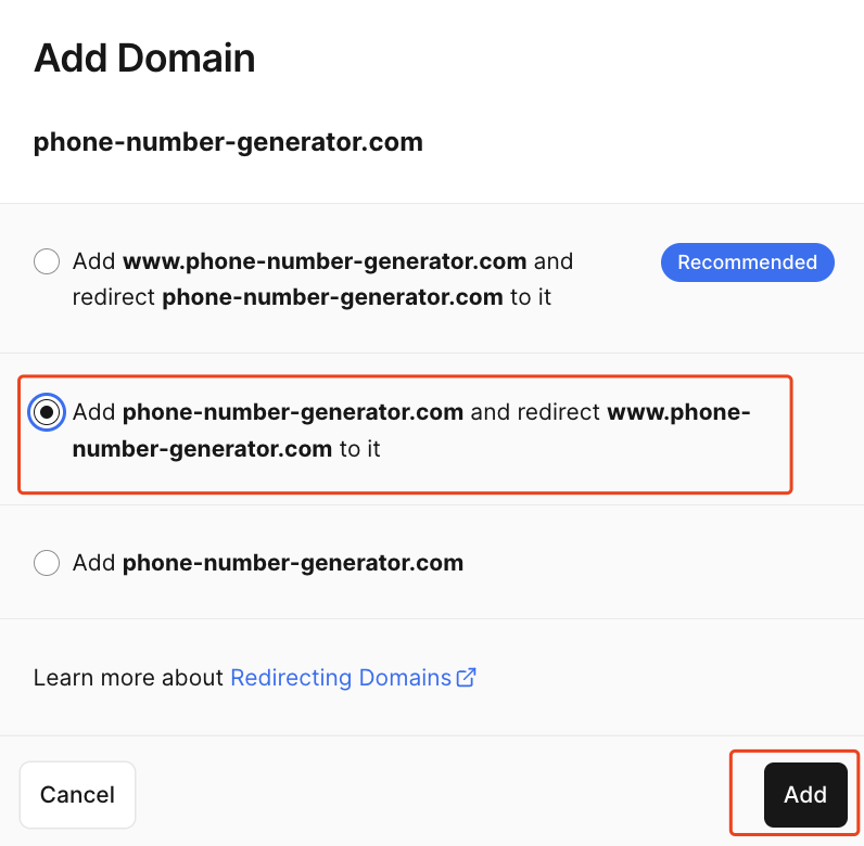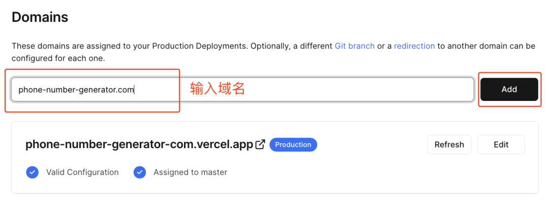 在输入框输入我们的域名,然后点击“Add”按钮。