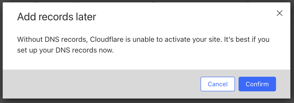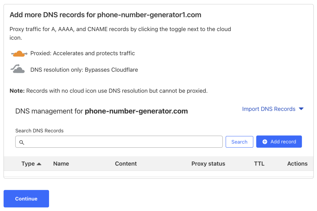 点击继续按钮后就到了下一页,Cloudflare 会扫描你的域名目前已经有的dns解析记录,如果你是老域名,相当于 Cloudflare 会帮你把所有旧的解析记录都同步过来,这样就可以无缝迁移。我们这里是新域名,所以解析记录为空,直接点击继续按钮就可以了。