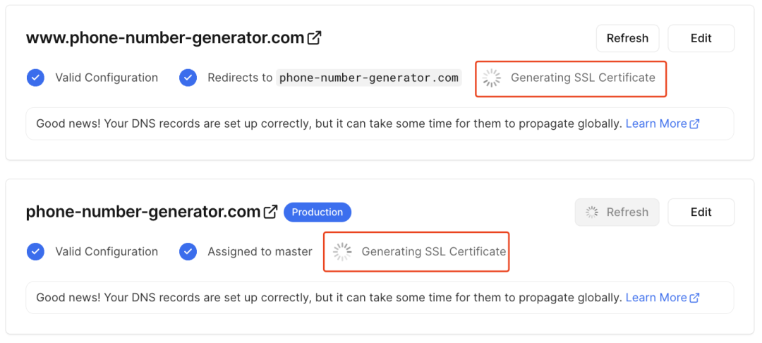 添加好 dns 解析记录后,在 Vercel 后台可以看到,正在为我们生成 ssl 证书。