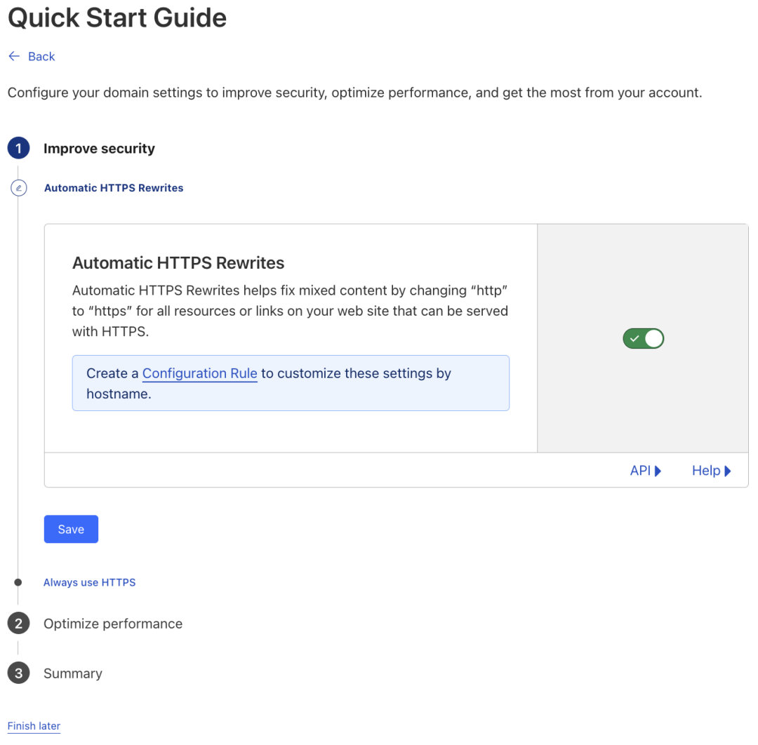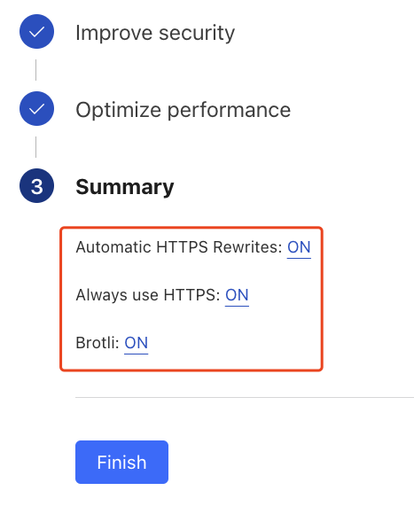 下一步,开启“Automatic HTTPS Rewrites”,开启“Always Use HTTPS”,开启“Brotli”。