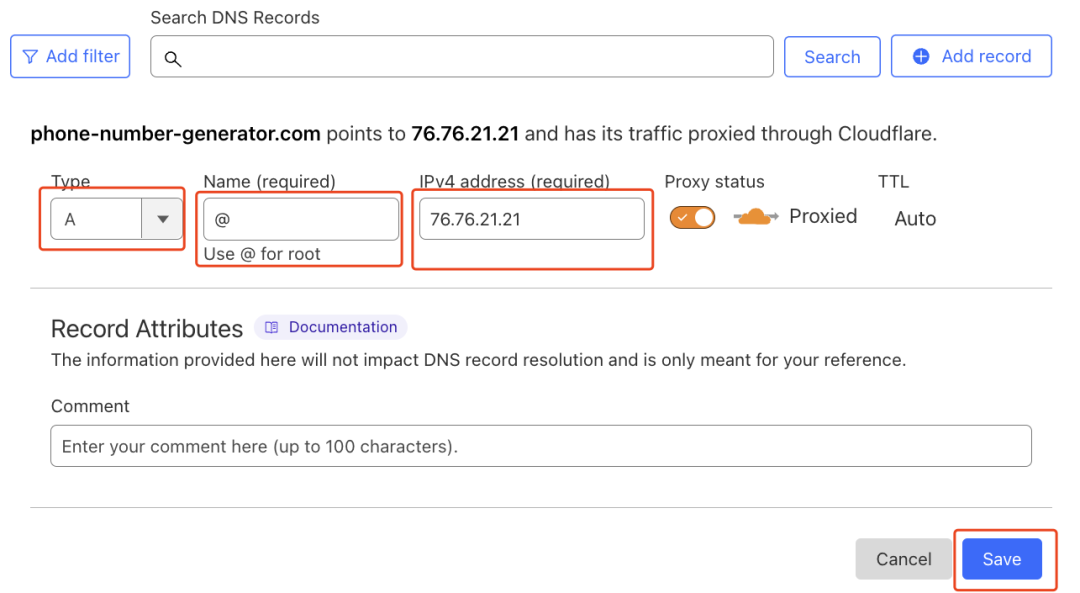 按照 Vercel 的要求,www域名添加 CNAME 记录,按照下方截图所示填写好,点击保存。