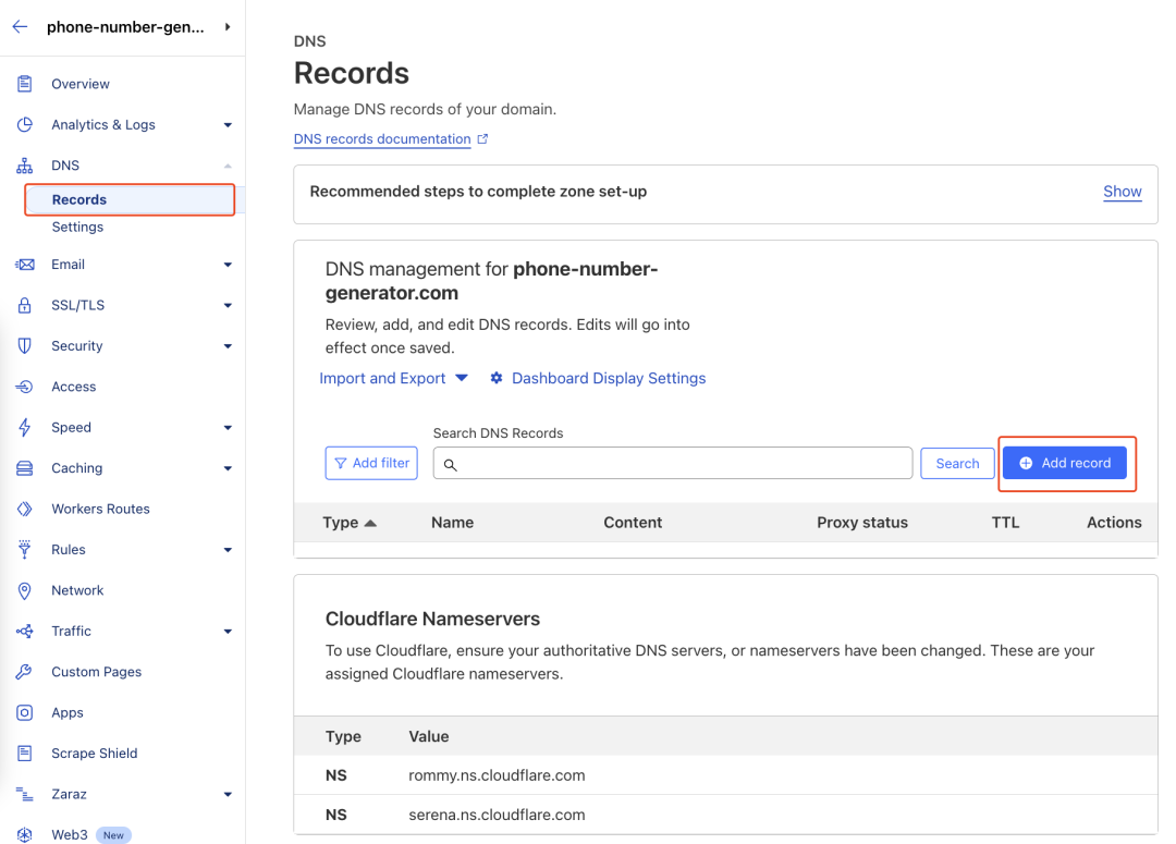 打开 Cloudflare 的网站列表,点击域名DNS解析记录,点击“Add record”按钮。
