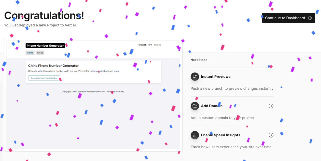 部署成功后,可以看到撒花界面。点击右上角的“Continue to Dashboard”按钮。