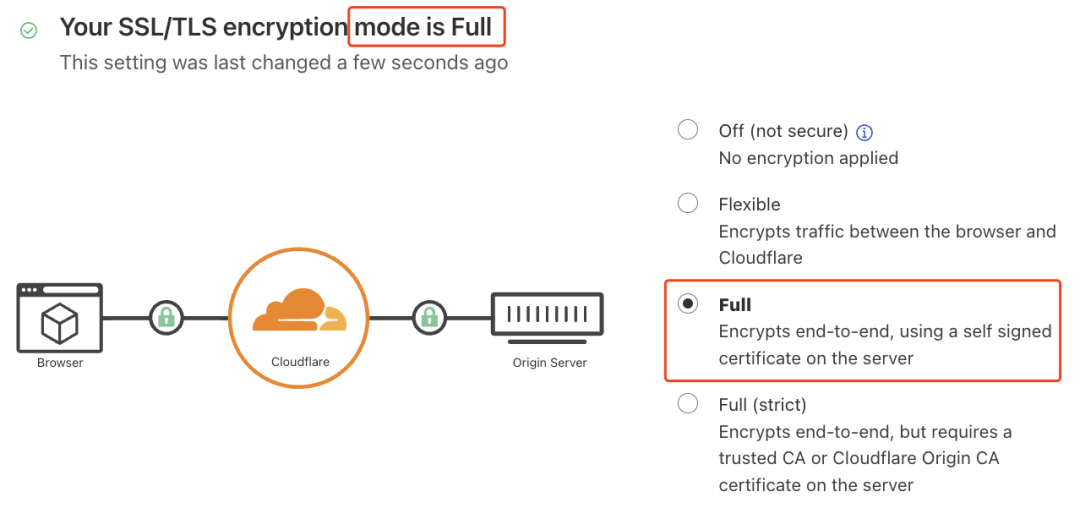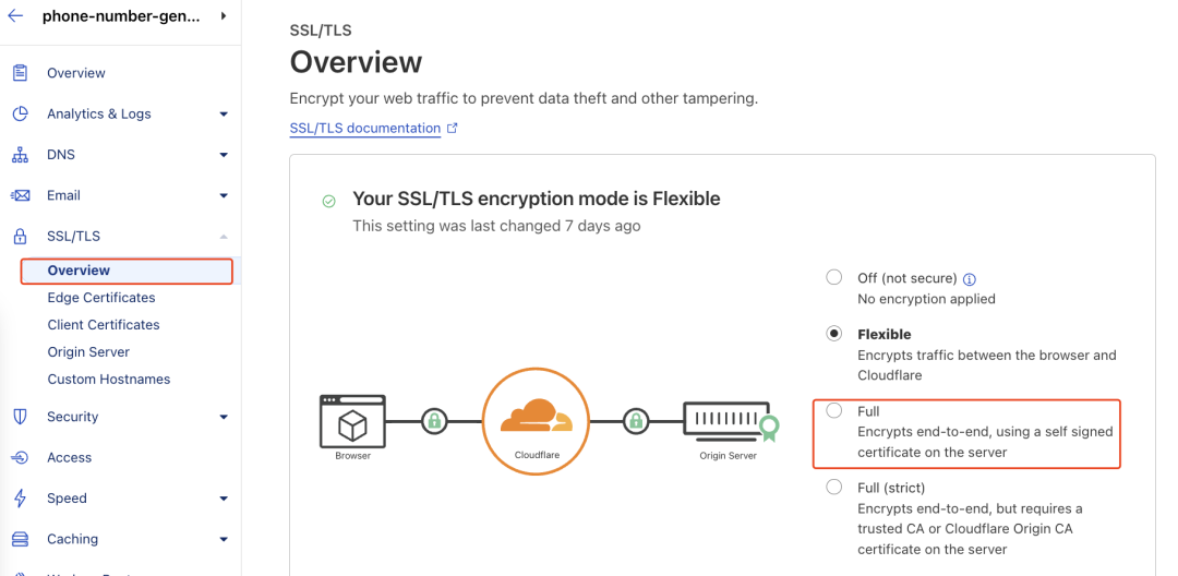 这是因为我们还有一个步骤忘了操作,打开 Cloudflare ,进入 SSL/TLS 界面,会发现目前的模式是“Flexible”,我们需要调整为“Full”模式。