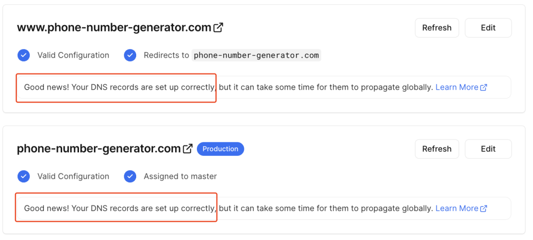 之后我们需要进行域名解析,带www和不带www域名,Vercel 给了两种解析方式。我们按照提示照做就行。
