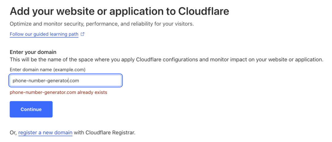 然后输入我们的域名,哥飞这里之前已经添加好了,所以会提示已经存在。