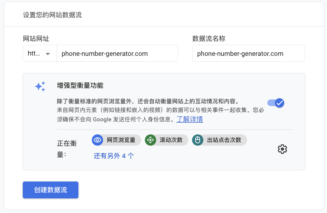 设置网址的协议,域名,和网站名称,点击“创建数据流”按钮。