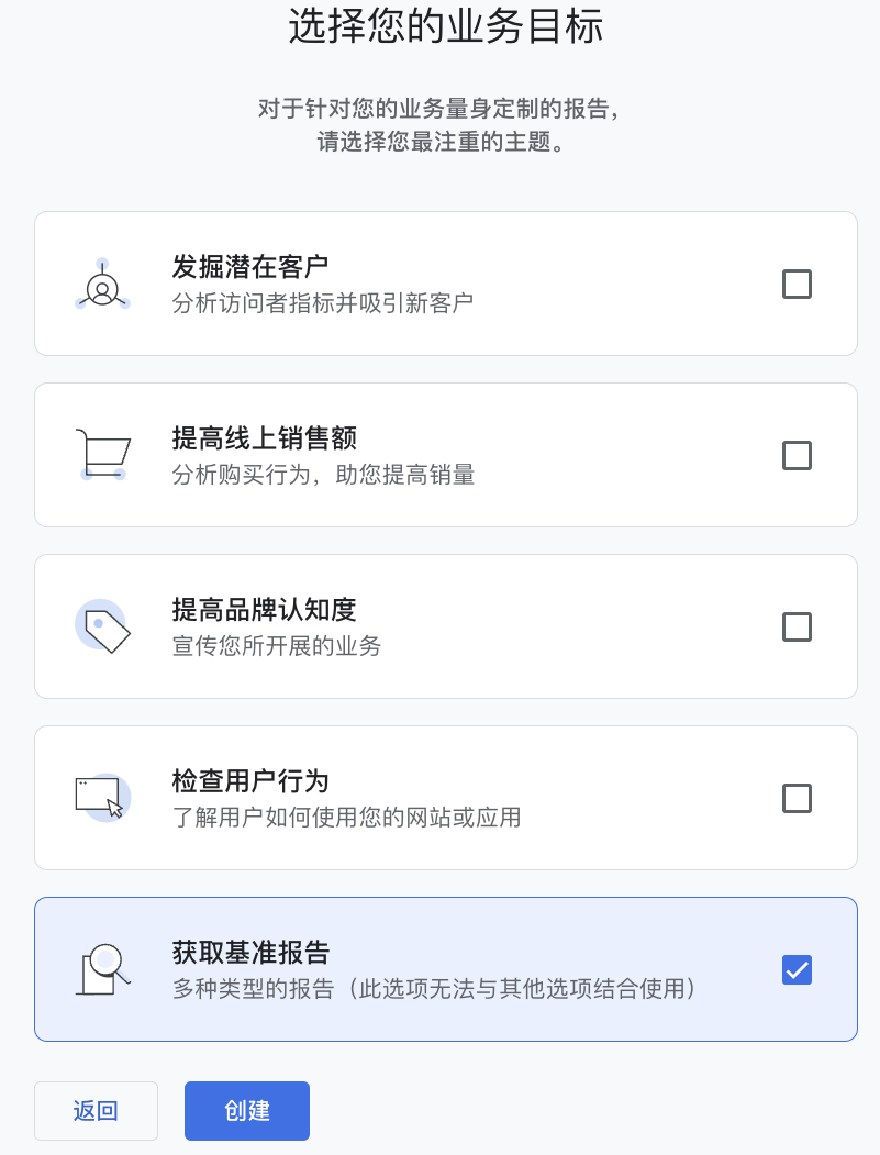 业务目标选择为“获取基准报告”,点击“创建”按钮。