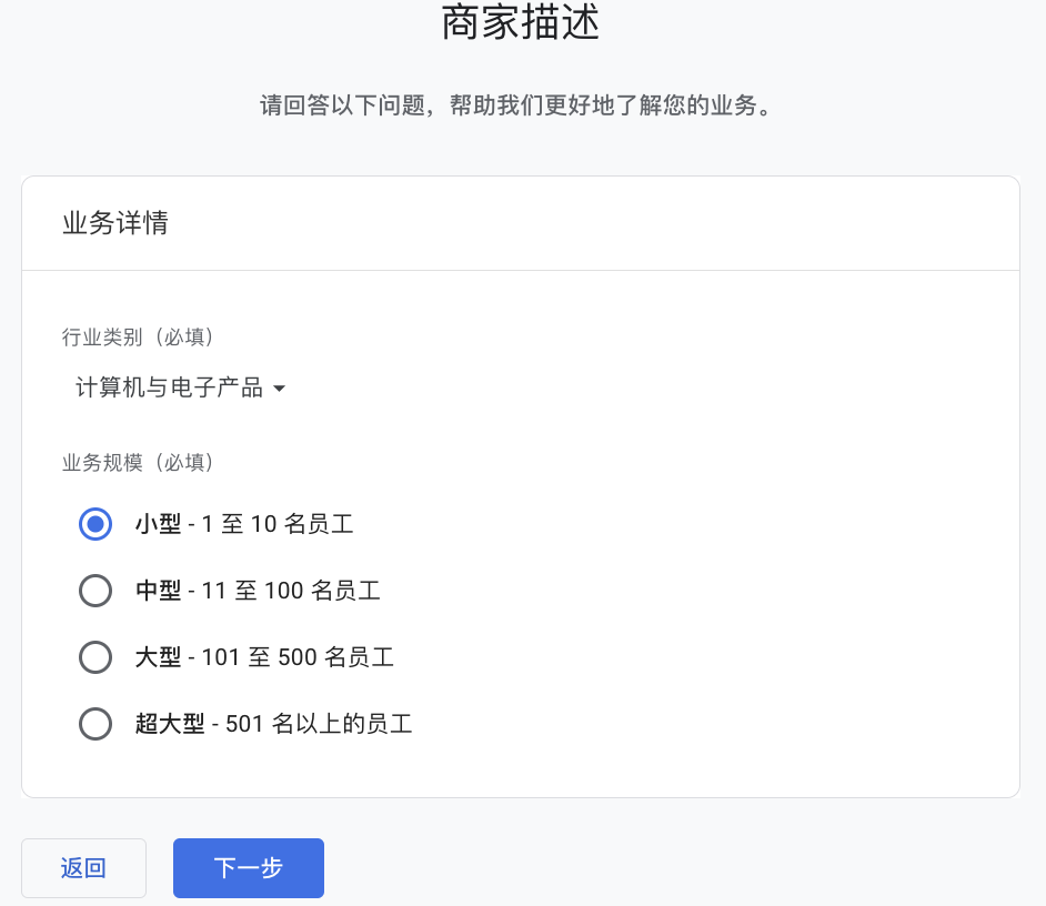 商家描述这里选择合适的网站行业类别,选择业务规模为小型。