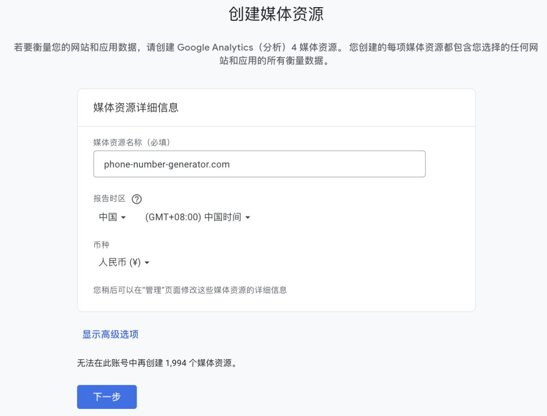媒体资源名称填写网站名称或者域名都可以,哥飞这里填写域名,点击下一步。