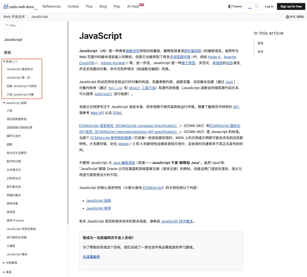 然后你就可以开始学原生 JS 知识了,这个时候,你就没必要去跟着视频学习了,直接打开 MDN ,了解一下 JS 是什么,能干什么,把快速入门学完。