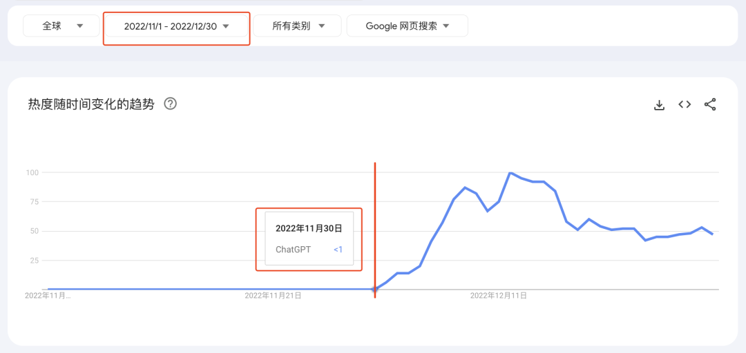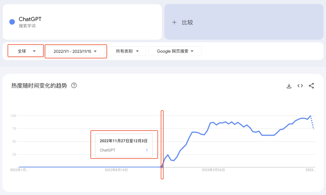 我们知道 ChatGPT 是2022年的11月30日上线发布的,从上面的谷歌趋势图里可以看到,这个词最开始有搜索量,范围是2022年11月27日至12月3日。这跟11月30日上线时间是对得上的。