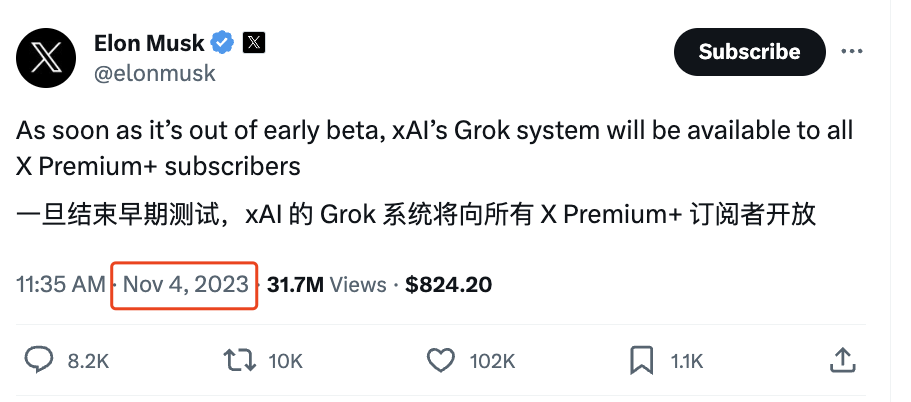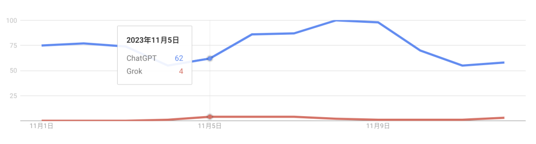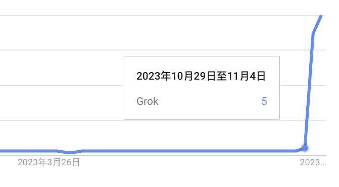 我们再拿 Grok 来看下,这个词之前一直有些搜索量,但不大。直到马斯克在11月4日发推宣布了xAI的第一个产品名字是 Grok,这个词的搜索量开始上升。