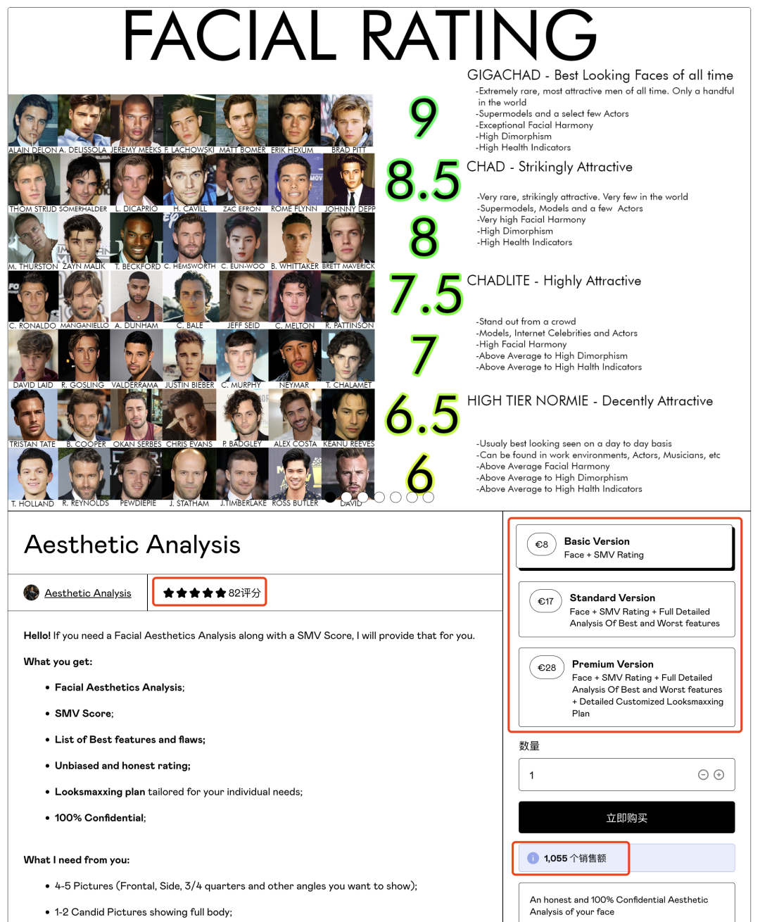 我们打开这个页面看一看,原来是卖颜值打分服务的。