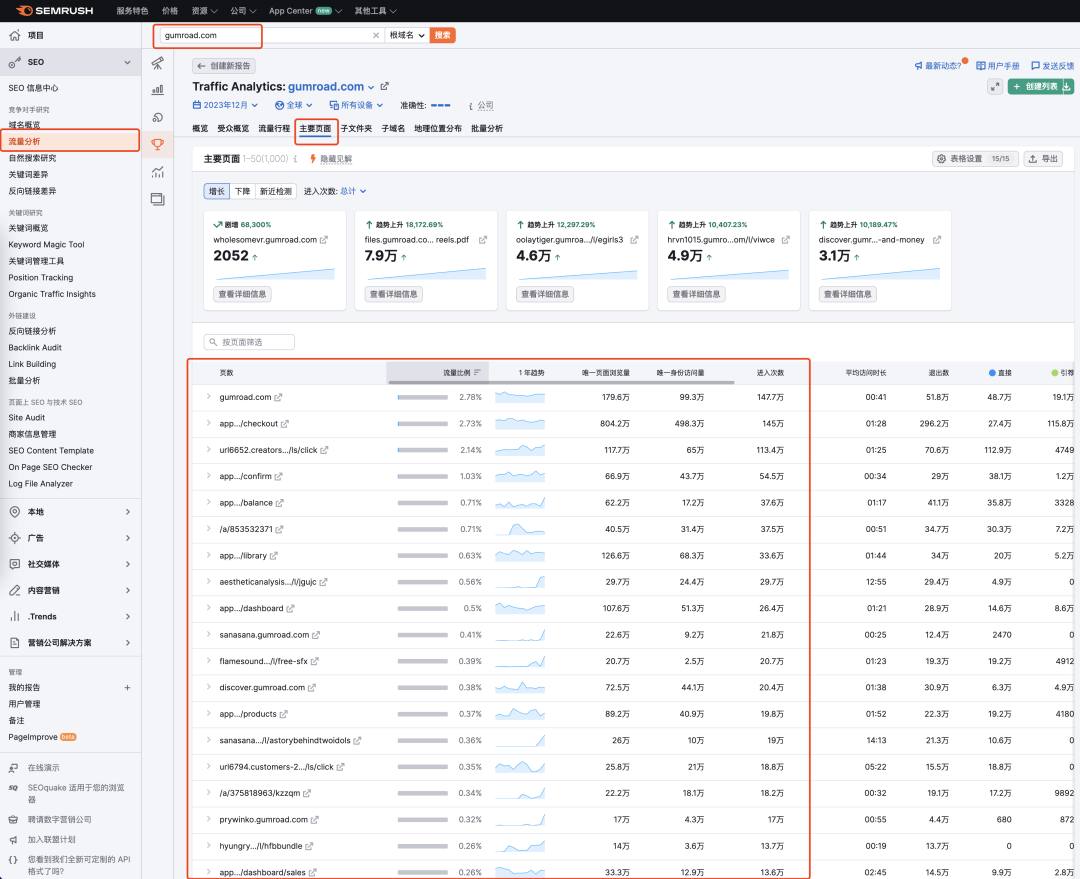 方法很简单,打开 Semrush ,输入 Gumroad.com ,点击流量分析,点击主要页面,然后就可以针对查询出来的结果进行分析了。