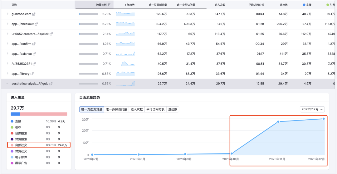 哥飞拿几个页面给大家做个示范,这里边有一些是 Gumroad 的网站功能页面,我们忽略掉,往下看,看到第9个,展开之后可以看到,主要流量来自于社交平台,从10月份才开始有流量的,11月就到了二十多万访问量。