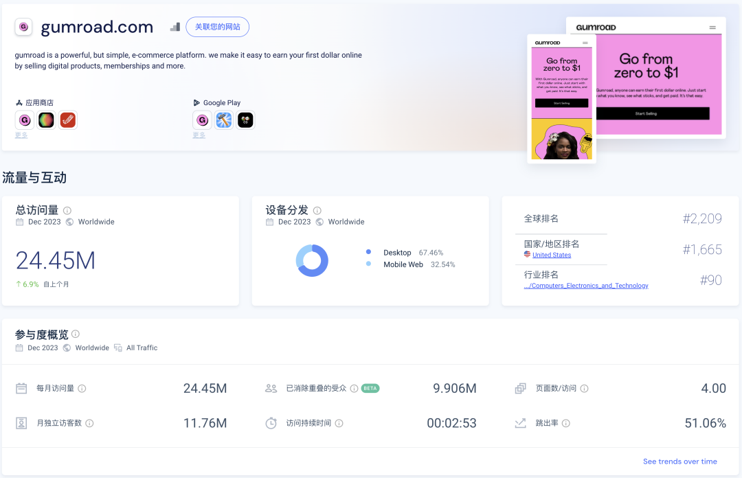 我们先看下 Gumroad 的流量数据,打开 Similarweb 可以看到,目前 Gumroad 月访问量是2445万,人均访问4个页面,平均停留时间接近3分钟。