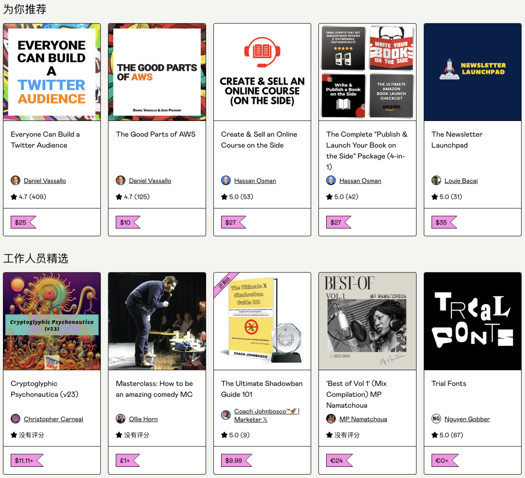 打开 Gumroad 的发现页面,可以看到好多各种各样的商品。