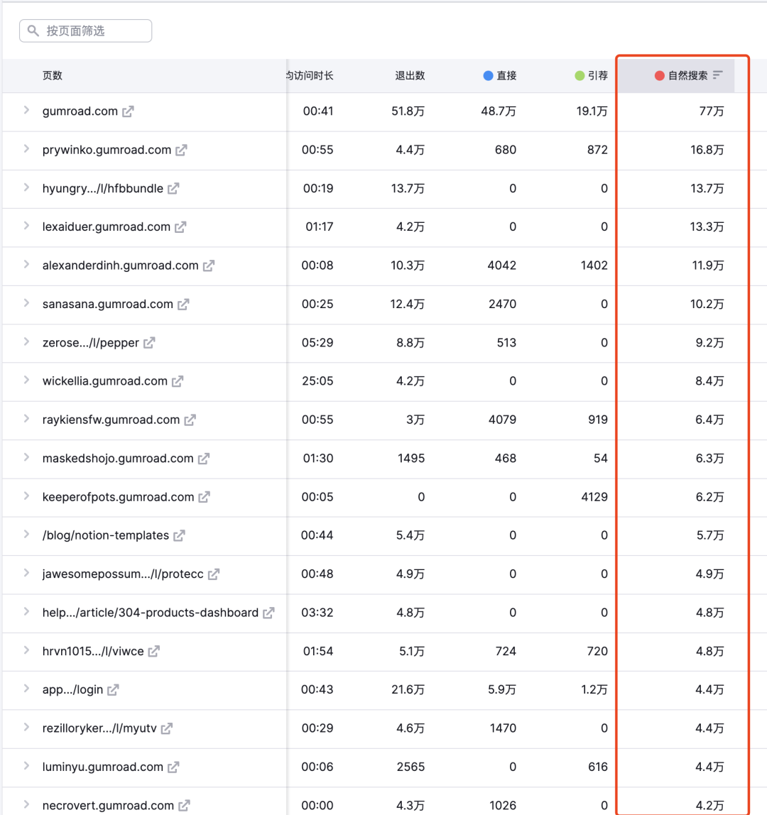 我们回到 Gumroad 的流量页面列表,选择按照“自然搜索”从高到低排序,就能够找到了。