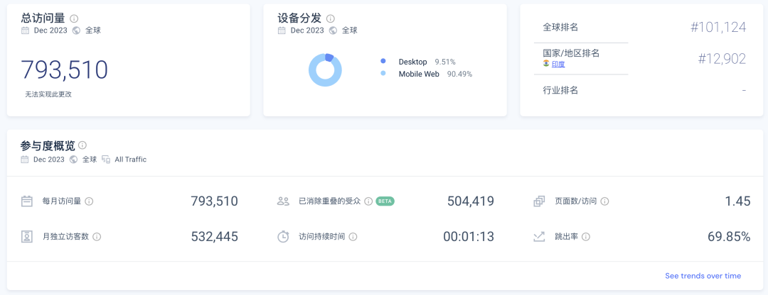 举个例子,有个网站,12月21日注册的域名,到12月31日,10天时间,网站流量就达到了79万。