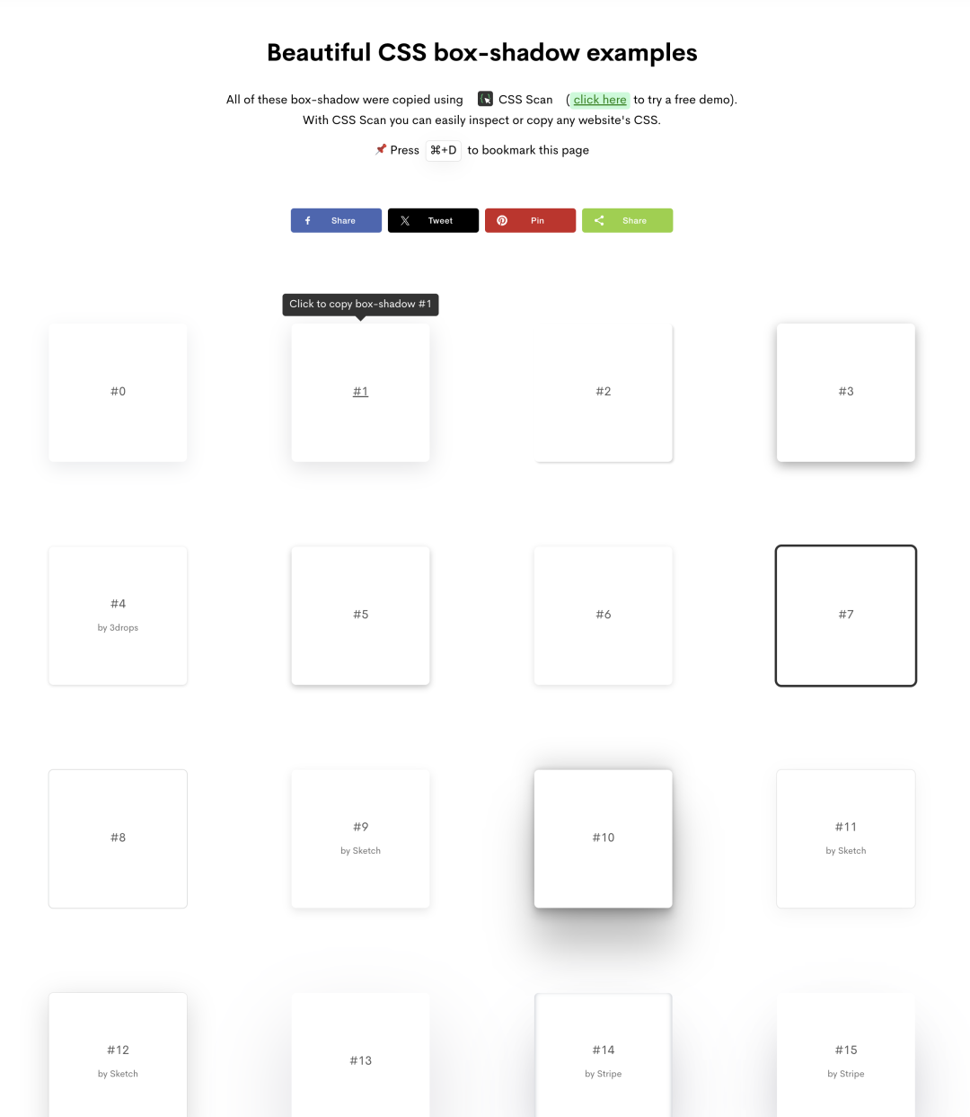 这个网页解出来了几十种不同的 css 盒子阴影效果,看中哪个了,直接点击就复制到了 css 代码,拿来放到你的 css 代码里去就能用。