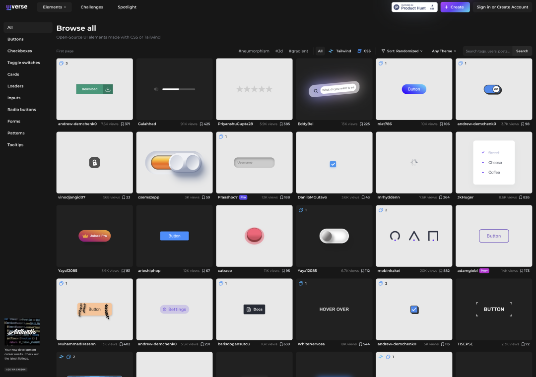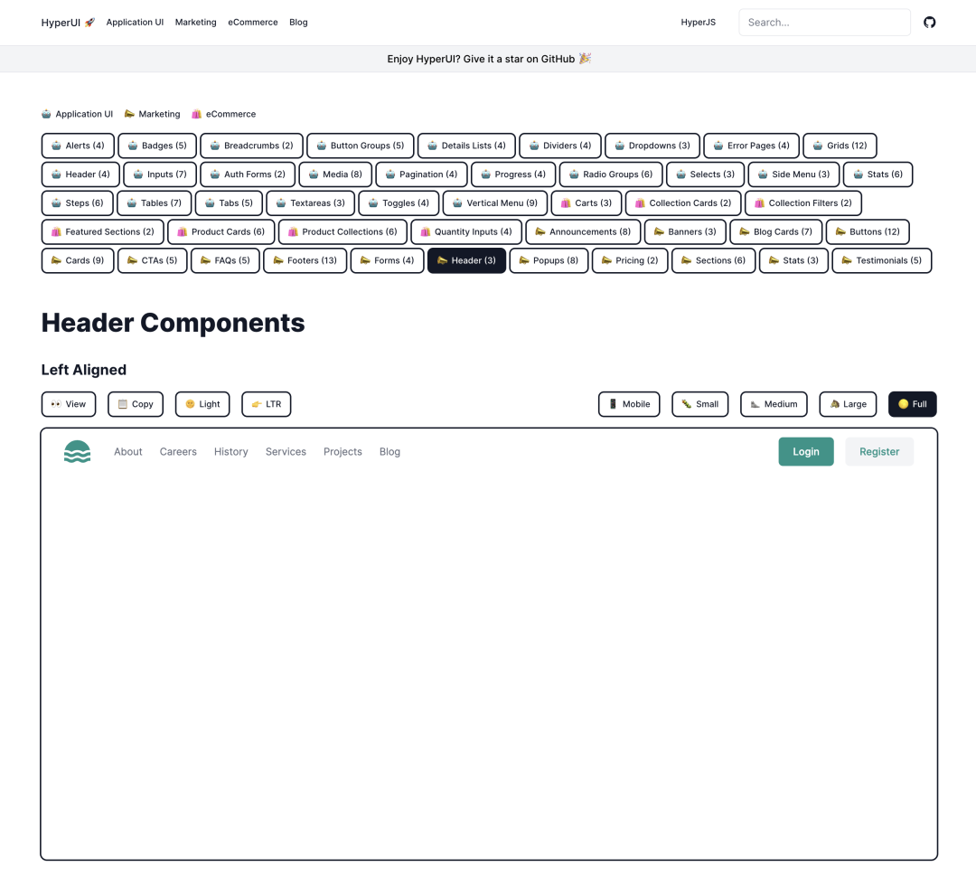 这是一个开源 Tailwind UI 组件库网站, 特点是,每一个组件都有多种不同的样式,每一种都支持在不同的宽度下看效果变化。