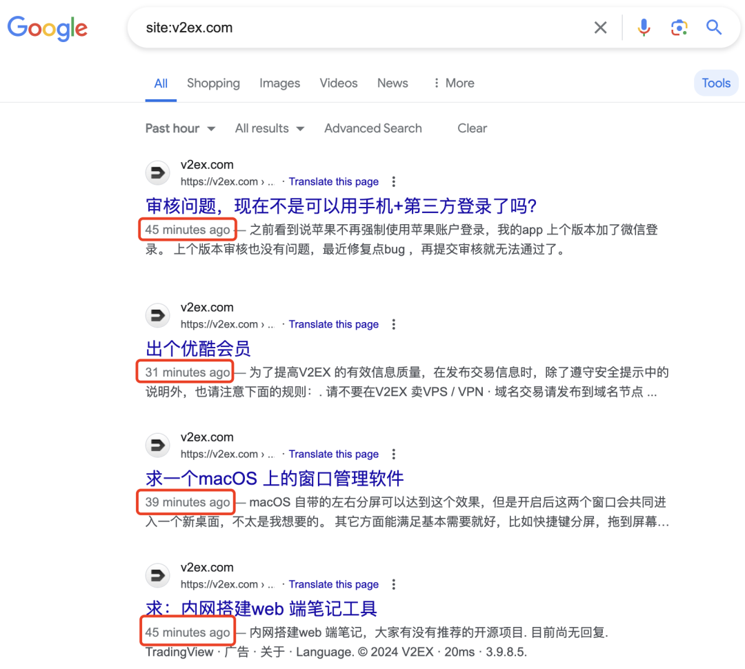 从上图可以看到,谷歌爬虫抓取 V2EX 还是很及时的,1小时内抓了很多新帖子。