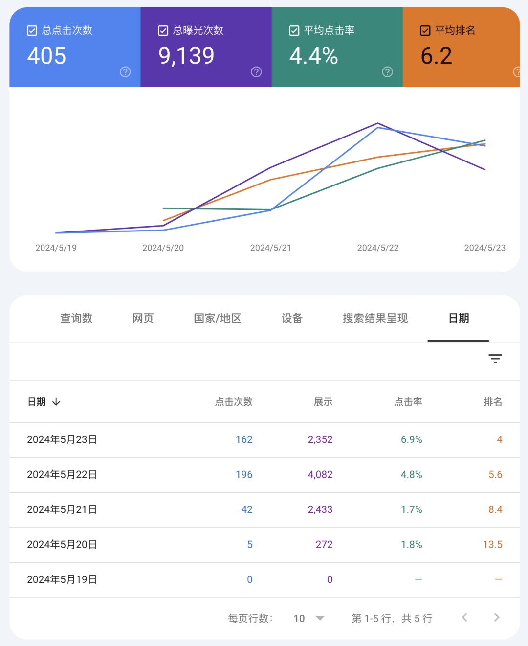 事实果然如哥飞所料,网站上线后,数据还不错,排名在不断前进,曝光点击都还可以。