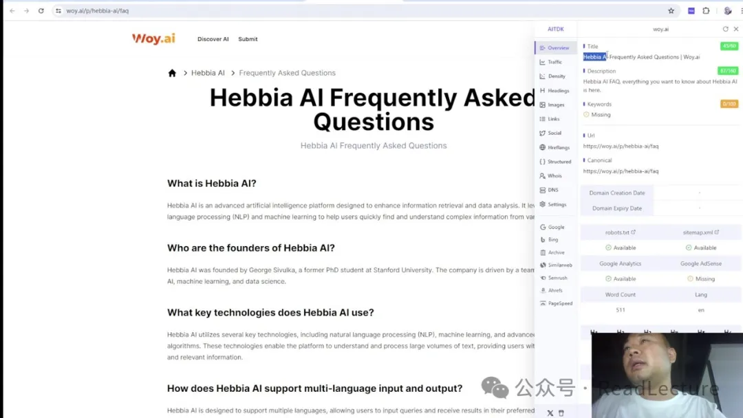 可能会搜索Hebbia AI的常见问题解答(FAQ)。因此,我专门设置了这一页面。在该页面下,其标题直接为“Hebbia AI FAQ Frequently Asked Questions”。此处,应将“FAQ”这三个字母也包含在内,因为有些用户可能是通过搜索“FAQ”来查找信息的。根据我的Google Search Console(GSC)数据显示,我的一些部分页面已获得曝光和排名。稍后将详细解释。例如,我将以某个产品为例进行说明。