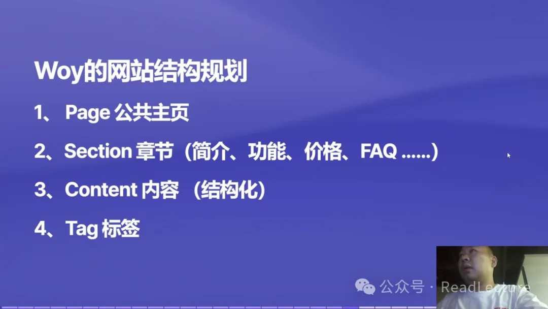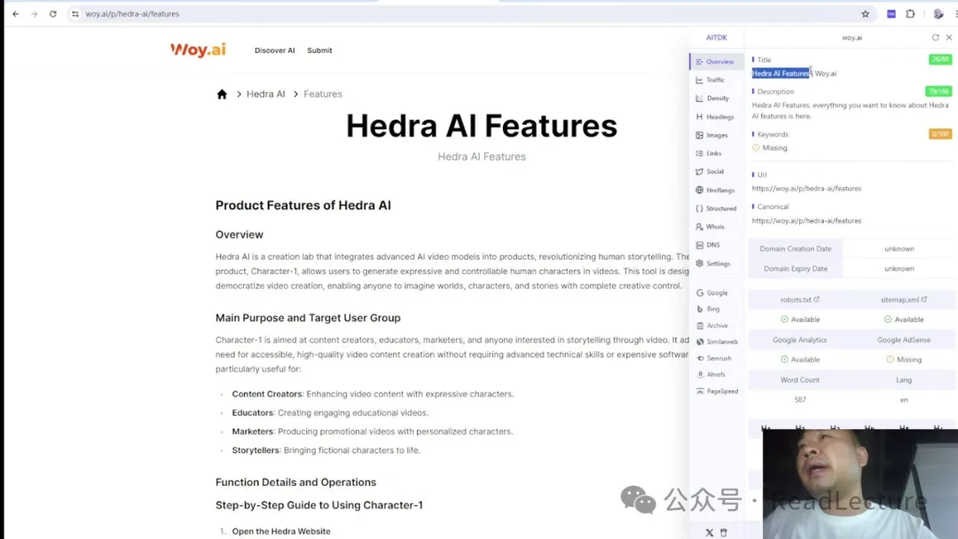 我还单独生成了Section Name的页面结构。例如,如果输入的产品名称是Hedra AI,那么这个名称就是Hedra AI Fetures。目前,我只设置了20多个Section,这些设计的原因可以在我的公众号文章中找到。点击我们直播左上角的哥飞出海视频号,可以找到关联的公众号哥飞,里面有300多篇免费文章,详细介绍了这些教程。