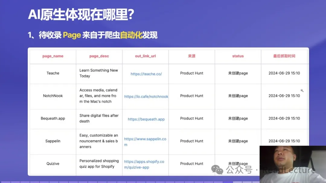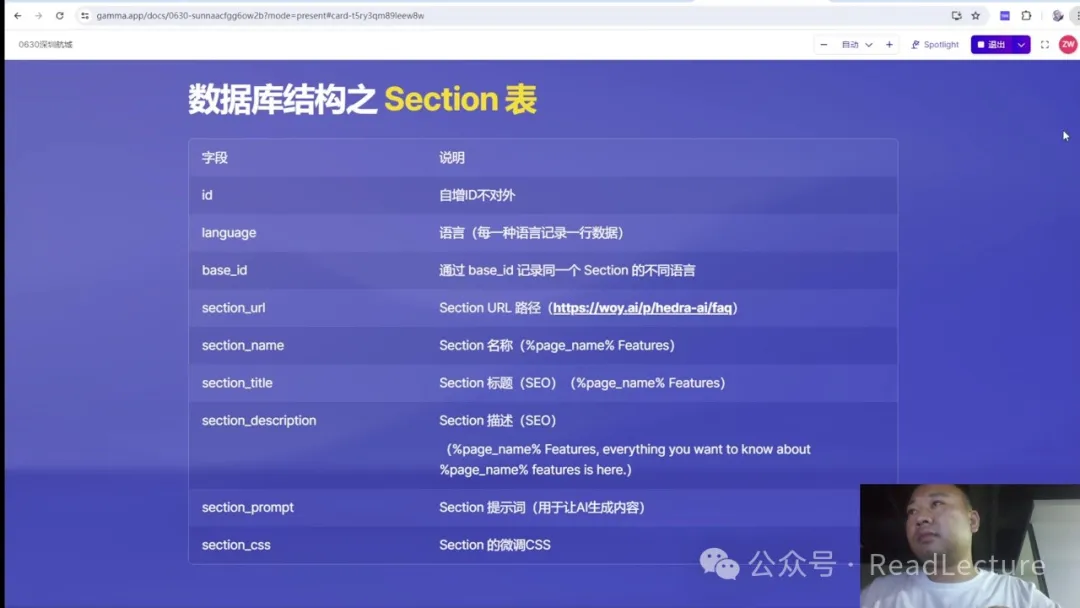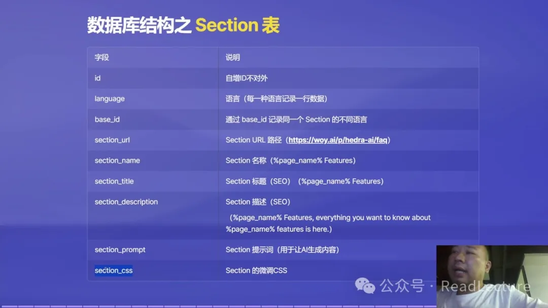 刚才我演示大家会看到,那里面直接把产品的使用介绍也放进来了。有回放的。对,就是说同一个section我在对应不同的配置,我提示词像是相同的。所以这里大家也会看到,我这个section表,我并没有跟配置关联的。也就是说并不是我的section记录,我这行section记录我并不是跟某个配置有关系的。我这是一个单独的section。举例来说,我现在目前主要是收录AI相关的产品。那我就找了一下,找了20多个section,主要是为了做AI产品。举例来说,AI产品的介绍,功能特性,FAQ,然后什么prising,它的团队介绍,它的使用教程等等所有的,写了20多个section。但其实目前我收录的时候,我发现有一些暂时还没有收录上去,就用不上。我暂时只放出了最多的也只放出了四五个。