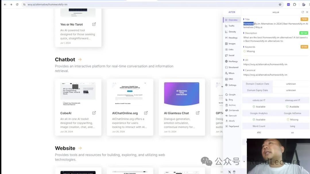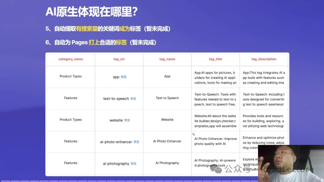 关于全自动镜像站群利用AI伪原创能带来流量的问题,这里还是不太可能能够带来流量的。因为AI生成内容,尤其是伪原创之类的,意味着没有独特的信息。将哪部分内容让GPT匹配标签呢?把你的生成的介绍部分,还有它的一些key features(核心功能点),把这几个扔进去,给GPT匹配标签。因为我们的标签本身就是基于功能去打的标签,所以你把产品介绍和key features传进去之后,就能够打到很不错的关联上的标签。Tag页面也静态化了。Tag和分类的关系,这里我的确要介绍一下。你会发现我整个网站我没有做分类,只做了Tag。为什么呢?如果你去看别的AI导航,他可能会做分类。因为在我理解为的是,分类是一个产品你只能分在一个内幕下面,而标签是你一个产品可以打多个标签的。这会有个什么样的问题呢?就是说,其实简单的对你这个产品经营一个分类没有多大意义,而且我用标签系统是可以做到分类效果的。举例来说,我们的标签目前有两个大类,一大类叫做产品形态,一大类叫做功能点。那我可以再增加一个叫做分类。