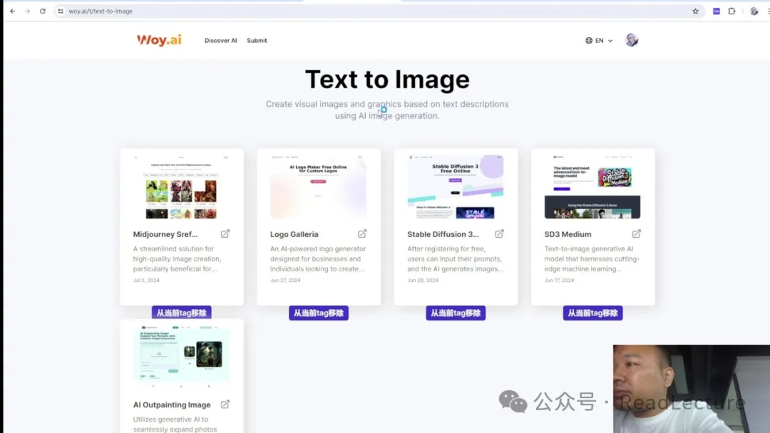 比如说这个text to image,即文字生成图片,大家看到这个页面打开还是挺快的。这个是涛涛做的一个处理。在文字生成图片这个标签下,我收录了一些产品,但这些产品暂时没有分门别类。后面我们可能会做一些分门别类的处理。它是基于SD模式开源的模式,还是基于其他的一些更细分的产品功能,比如生成logo。这里举了一个很好的例子,因为AI生成logo也是text to image,所以同一个产品可以打上不同的标签,也就是有子标签。在text to image下,可能会有更细分的标签,如text to logo、text to headshot(头像)、text to sticker(贴纸)、text to png image等,这些不同的分类最终都会在这个页面体现出来。也就是说,目前的标签页面还不是最终页面,只是先放出来了一个页面。