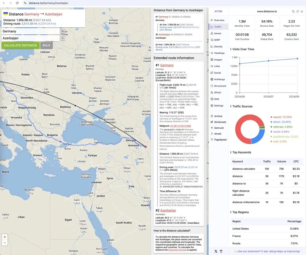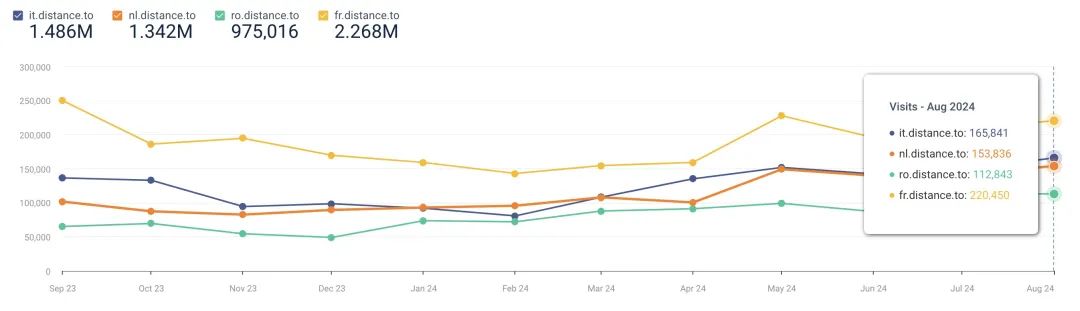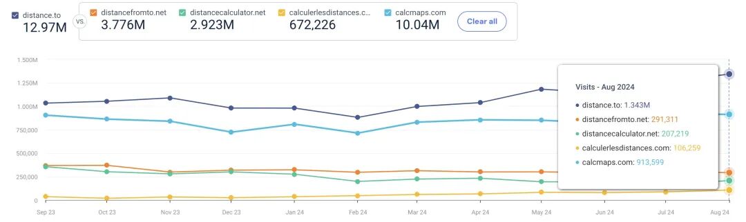 下面进入今天的哥飞小课堂,先看流量,Similarweb 下面几个网站的最近12个月访问量,最大的 distance.to 访问量1297万。